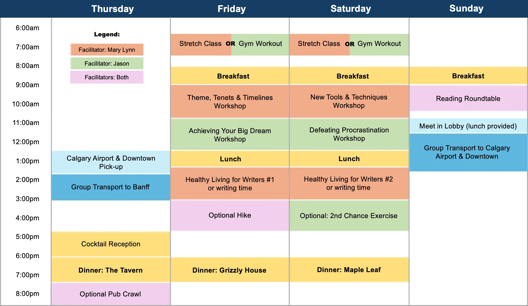 Think of this retreat as “all-inclusive.” We offer return group travel between Calgary and Banff, accommodations, meals throughout the weekend, a full itinerary of workshops, and optional activities such as a pub crawl, an all-levels hike, facilitated stretch or gym sessions, and spa services. The only aspects that incur additional costs are as follows: